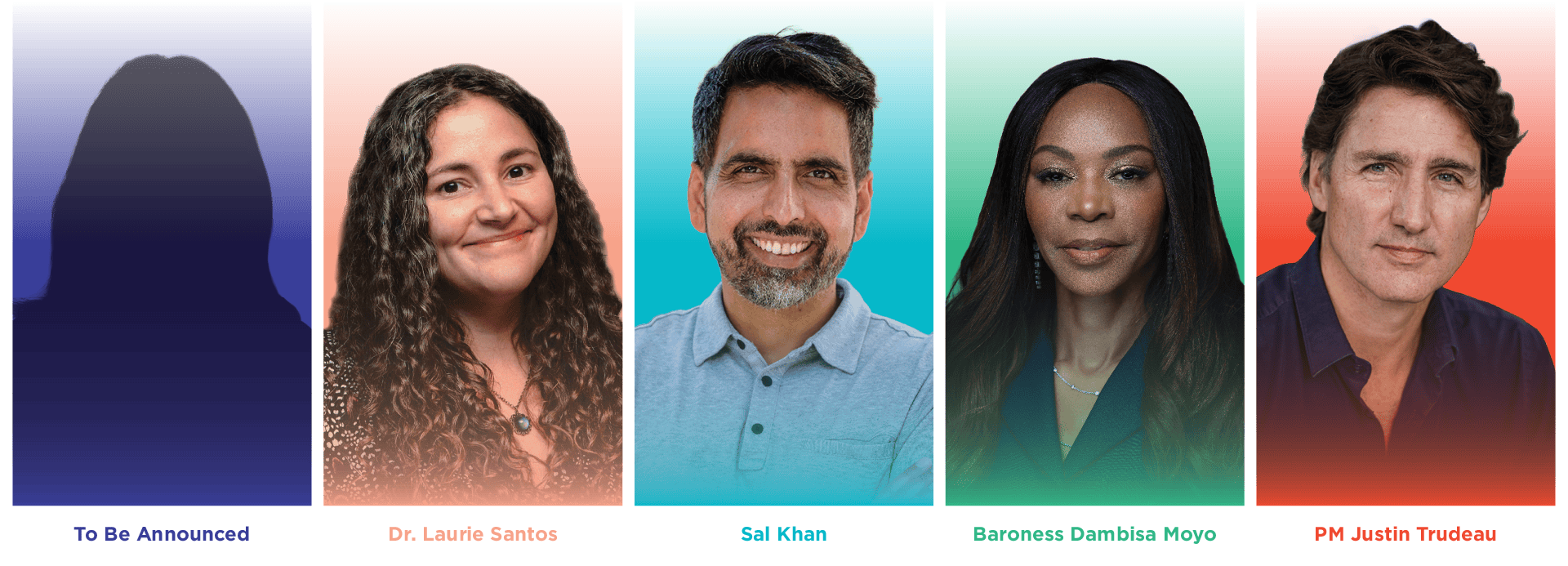 Justin Trudeau, Sal Khan, Dambisa Moyo, and Laurie Santos headline. Fifth speaker to be announced.